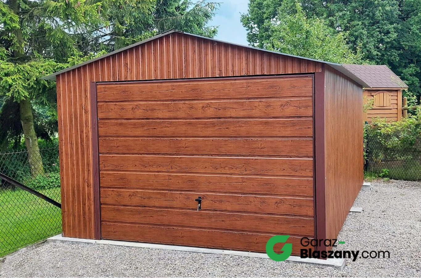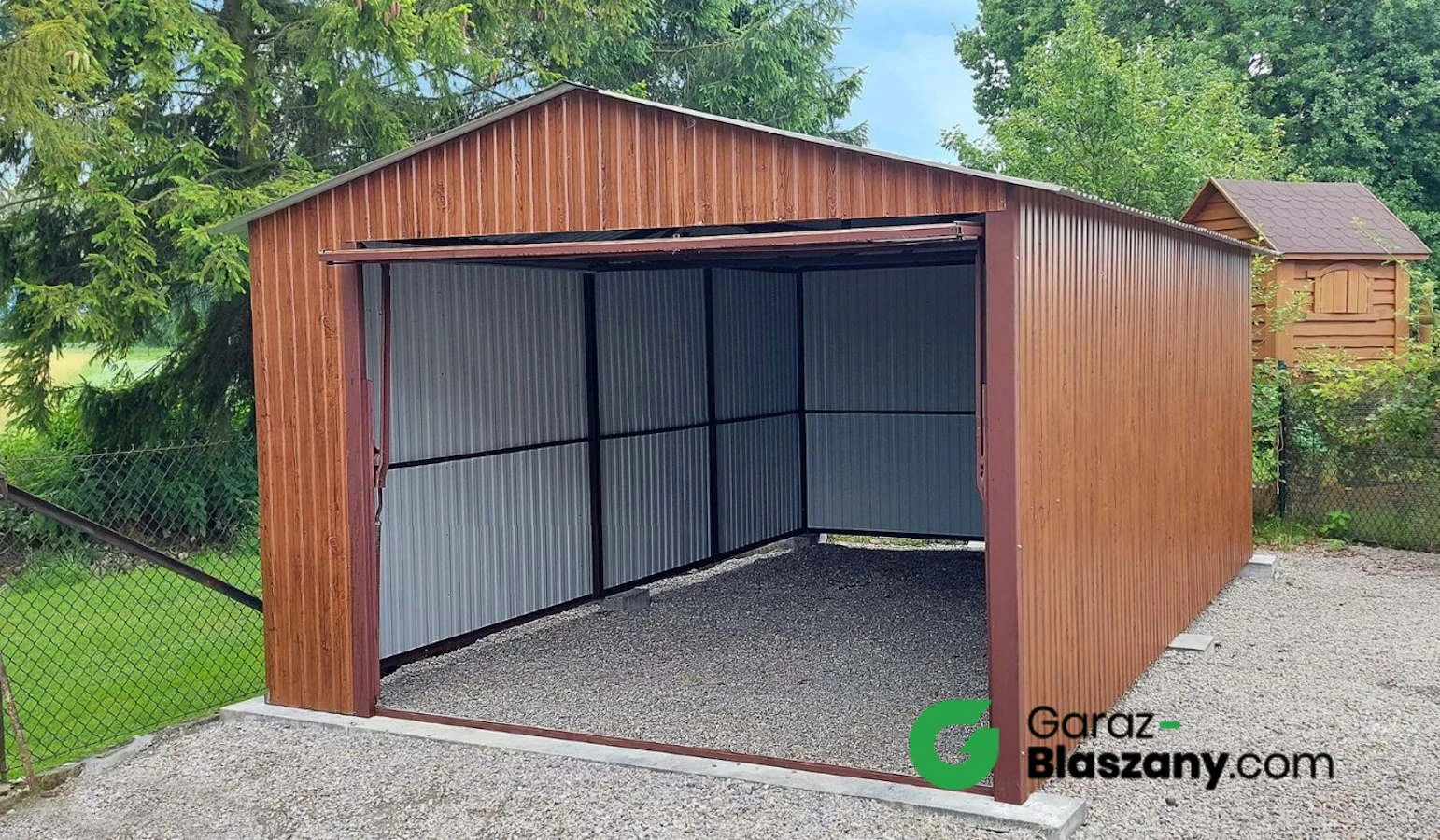 Garaż blaszany 3,5x5 Orzech, dach dwuspadowy, brama uchylna