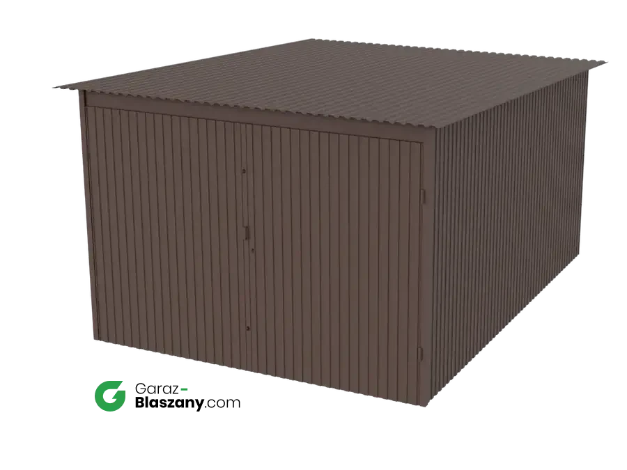 Garaż blaszany 3x4 brązowy mat (RAL 8017) dach jednospadowy brama dwuskrzydłowa - doskonale nadaje się jako domek narzędziowy lub niewielki magazyn dla firm. Łączy praktyczne zalety typowego garażu z minimalnym wykorzystaniem przestrzeni co czyni go uniwersalnym i idealnym do montażu na gęściej zabudowanych przestrzeniach.