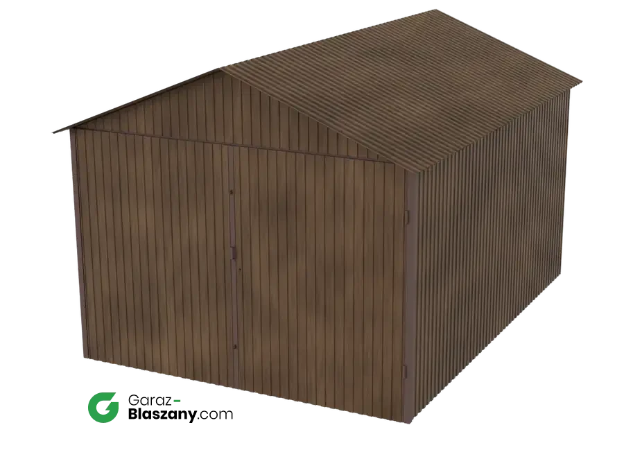 Garaż blaszany 3x4 drewnopodobny Orzech dach dwuspadowy brama dwuskrzydłowa