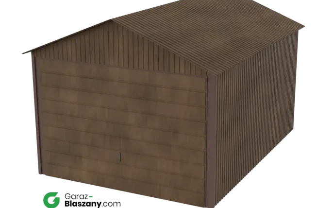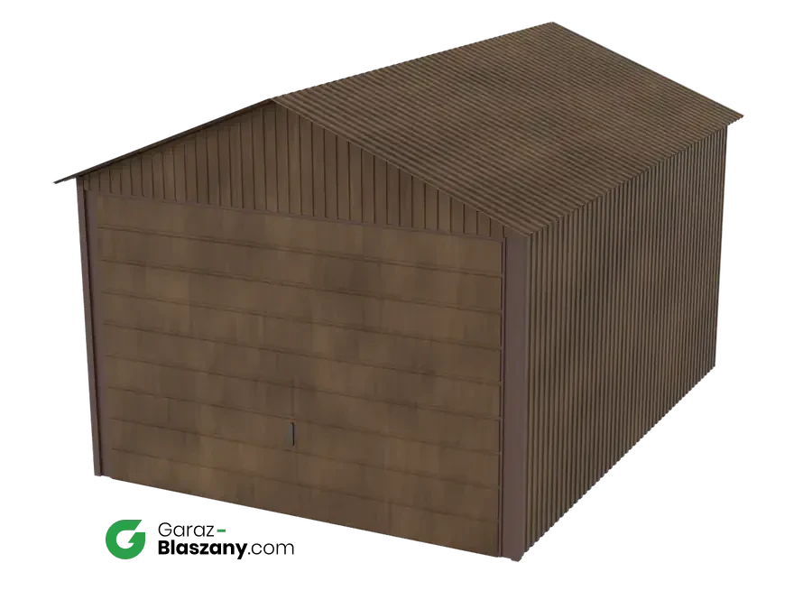 Garaż blaszany 3x4 drewnopodobny Orzech dach dwuspadowy brama uchylna