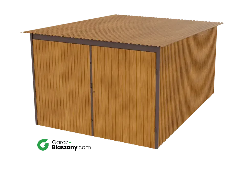 Garaż blaszany 3x4 drewnopodobny Złoty Dąb dach jednospadowy brama dwuskrzydłowa - doskonale nadaje się jako domek narzędziowy lub niewielki magazyn dla firm. Łączy praktyczne zalety typowego garażu z minimalnym wykorzystaniem przestrzeni co czyni go uniwersalnym i idealnym do montażu na gęściej zabudowanych przestrzeniach.