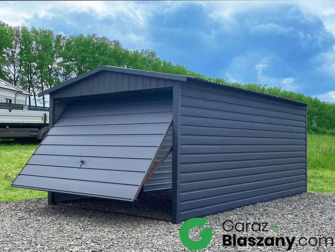 Garaż blaszany 3x5 m, grafit, z obróbkami blacharskimi: obrobki w naroznikach i wiatrownice (obrobki dachu w szczytowych ścianach), brama uchylna, dach dwuspadowy, szeroki poziomy panel - świetne rozwiązanie jako garaż dla samochodu lub schowek narzędziowy, a nawet jako domek ogrodowy.