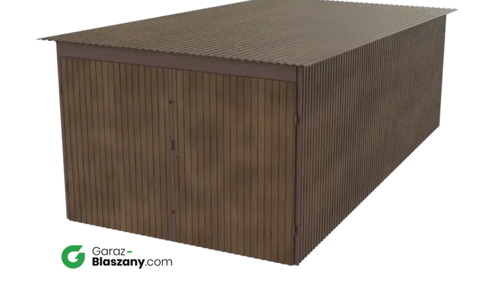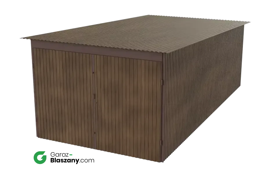 Garaż blaszany 3x6 drewnopodobny Orzech dach jednospadowy brama dwuskrzydłowa