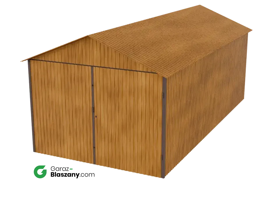 Garaż blaszany 3x6 drewnopodobny Złoty Dąb dach dwuspadowy brama dwuskrzydłowa