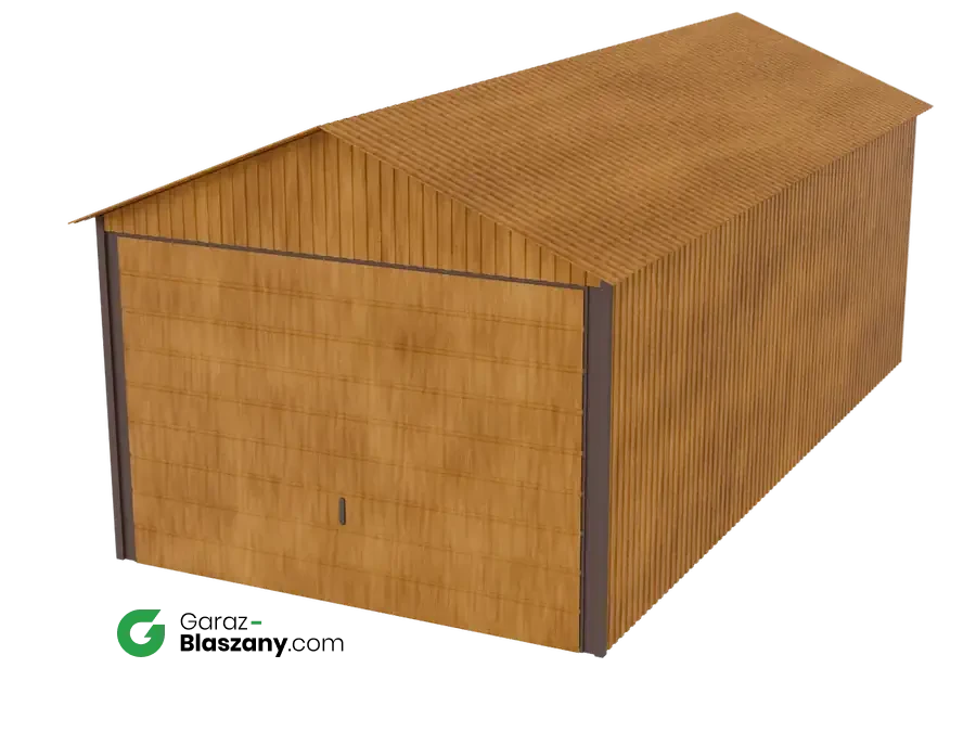 Garaż blaszany 3x6 drewnopodobny Złoty Dąb dach dwuspadowy brama uchylna