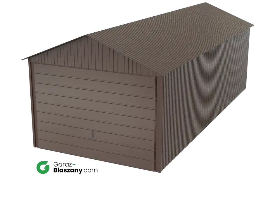Garaż blaszany 3x7 brązowy błysk dach dwuspadowy brama uchylna