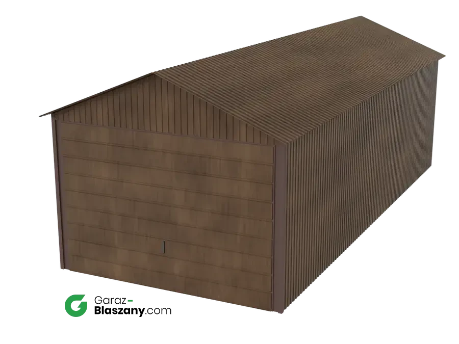 Garaż blaszany 3x7 drewnopodobny Orzech dach dwuspadowy brama uchylna