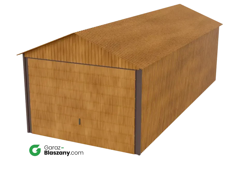 Garaż blaszany 3x7 drewnopodobny Złoty Dąb dach dwuspadowy brama uchylna