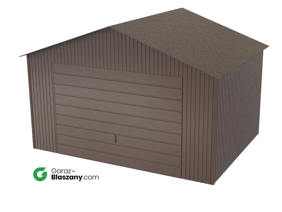 Garaż blaszany 4x3 brązowy BŁYSK dach dwuspadowy brama dwuskrzydłowa