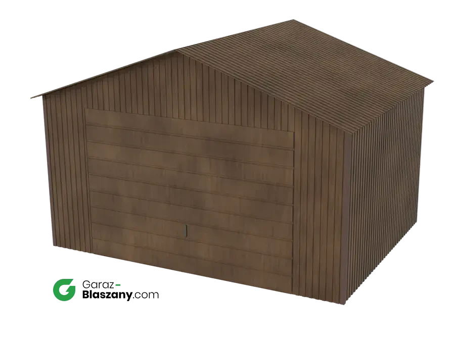 Garaż blaszany 4x3 drewnopodobny Orzech dach dwuspadowy brama dwuskrzydłowa