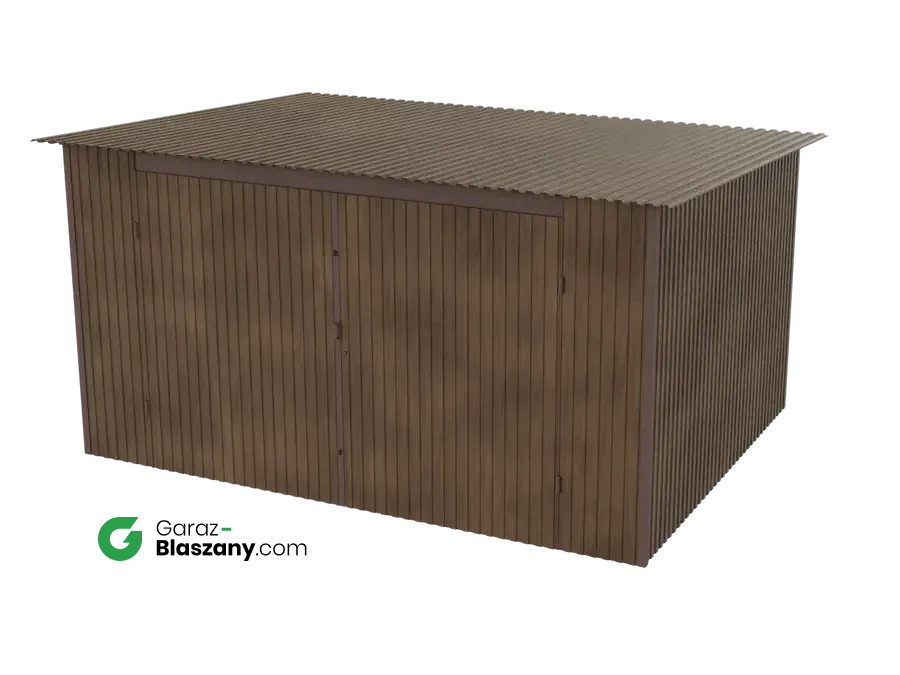 Garaż blaszany 4x3 drewnopodobny Orzech dach jednospadowy brama dwuskrzydłowa