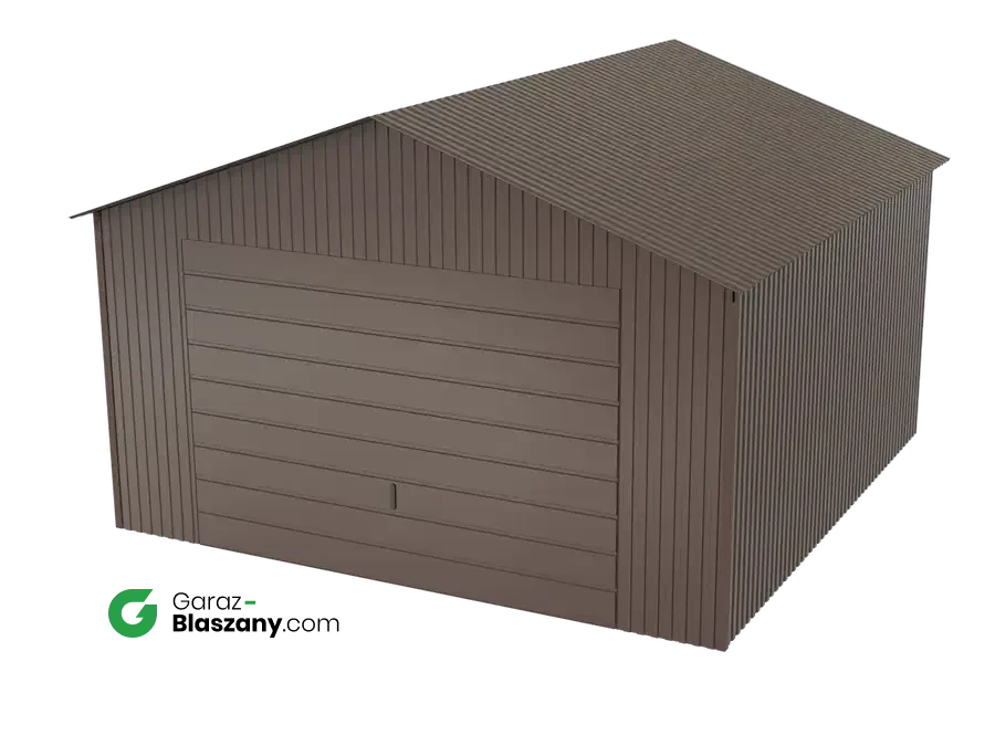 Garaż blaszany 4x4 brązowy BŁYSK dach dwuspadowy brama uchylna