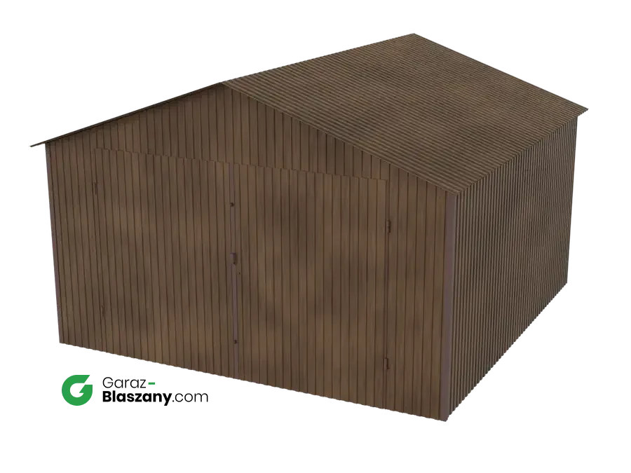 Garaż blaszany 4x4 drewnopodobny Orzech dach dwuspadowy brama dwuskrzydłowa
