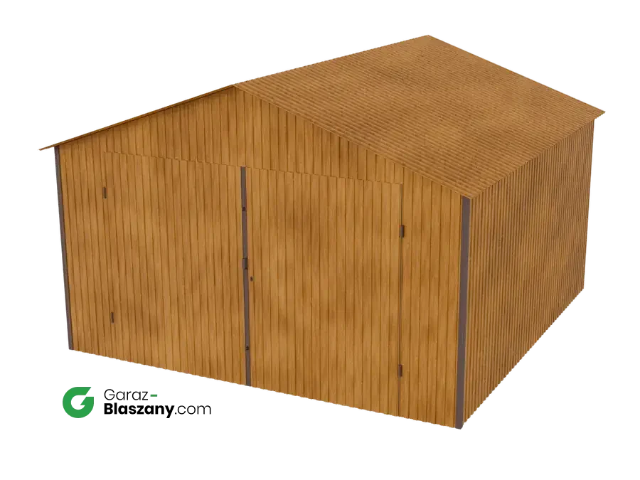 Garaż blaszany 4x4 drewnopodobny Złoty Dąb dach dwuspadowy brama dwuskrzydłowa