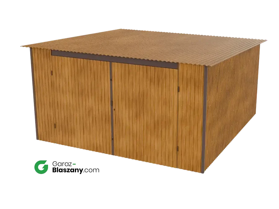 Garaż blaszany 4x4 drewnopodobny Złoty Dąb dach jednospadowy brama dwuskrzydłowa