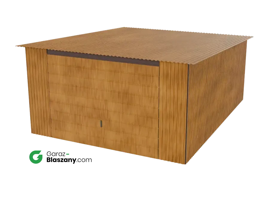 Garaż blaszany 4x5 drewnopodobny Złoty Dąb dach jednospadowy brama uchylna