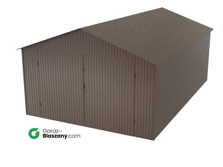Garaż blaszany 4x6 brązowy BŁYSK dach dwuspadowy brama dwuskrzydłowa