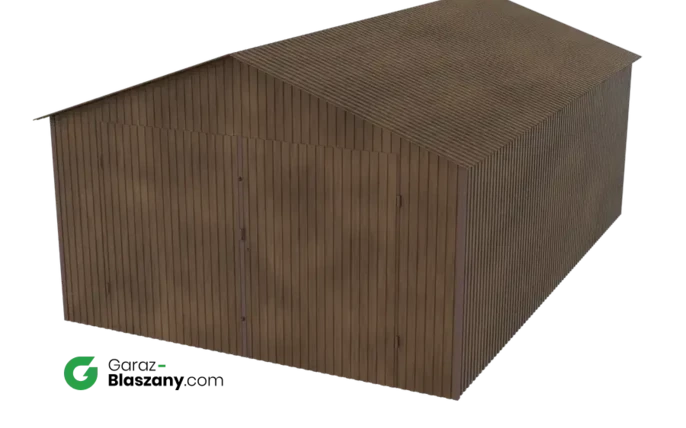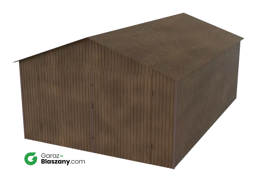 Garaż blaszany 4x6 drewnopodobny Orzech dach dwuspadowy brama dwuskrzydłowa