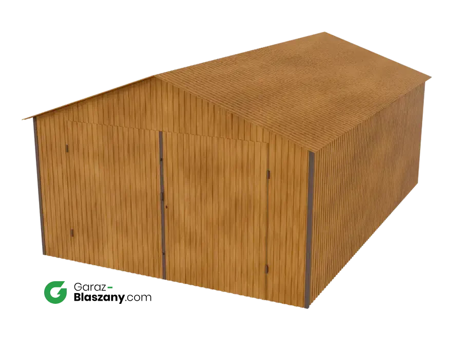 Garaż blaszany 4x6 drewnopodobny Złoty Dąb dach dwuspadowy brama dwuskrzydłowa