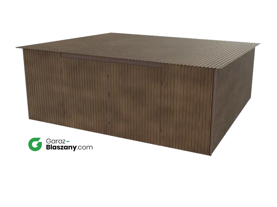 Garaż blaszany 5,5x5 drewnopodobny Orzech dach jednospadowy brama dwuskrzydłowa