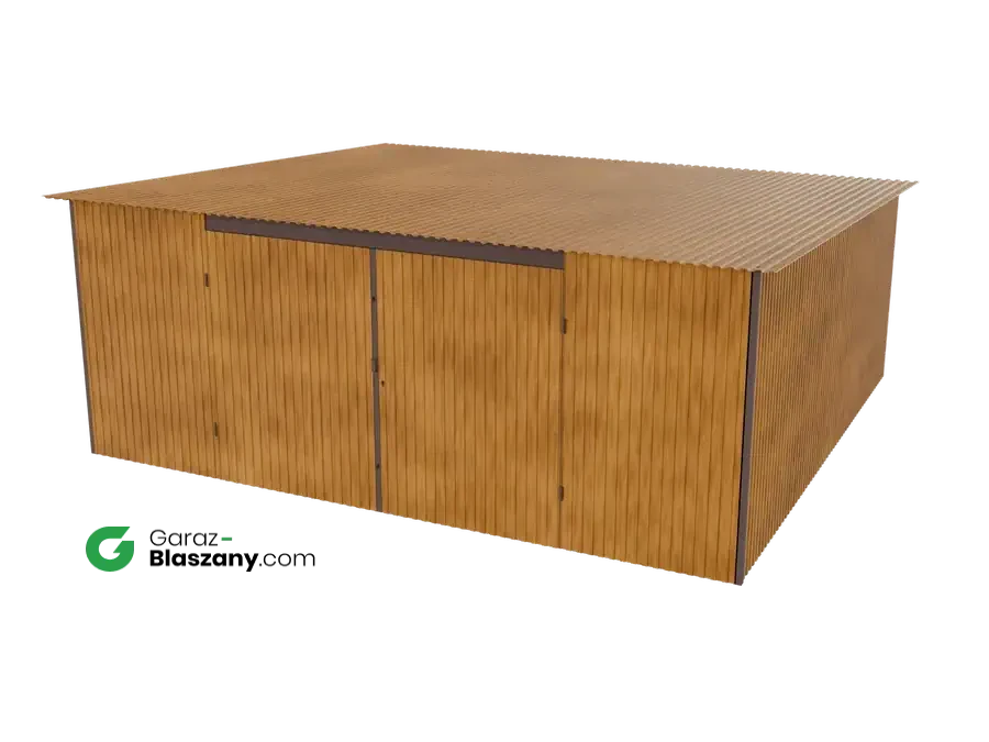 Garaż blaszany 5,5x5 drewnopodobny Złoty Dąb dach jednospadowy brama dwuskrzydłowa