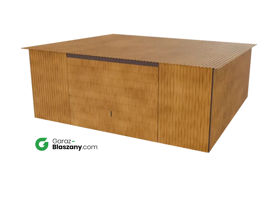 Garaż blaszany 5,5x5 drewnopodobny Złoty Dąb dach jednospadowy brama uchylna