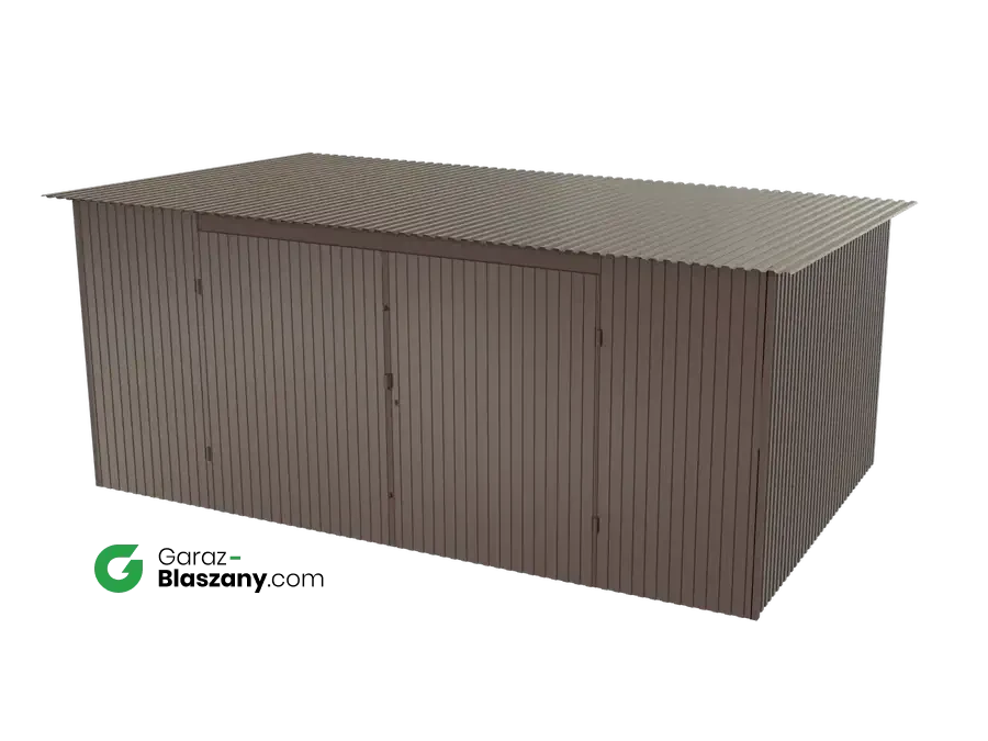 Garaż blaszany 5x3 brązowy BŁYSK dach jednospadowy brama dwuskrzydłowa - doskonale nadaje się jako domek narzędziowy lub niewielki magazyn dla firm. Łączy praktyczne zalety typowego garażu z minimalnym wykorzystaniem przestrzeni co czyni go uniwersalnymi idealnym do montażu na gęściej zabudowanych przestrzeniach.