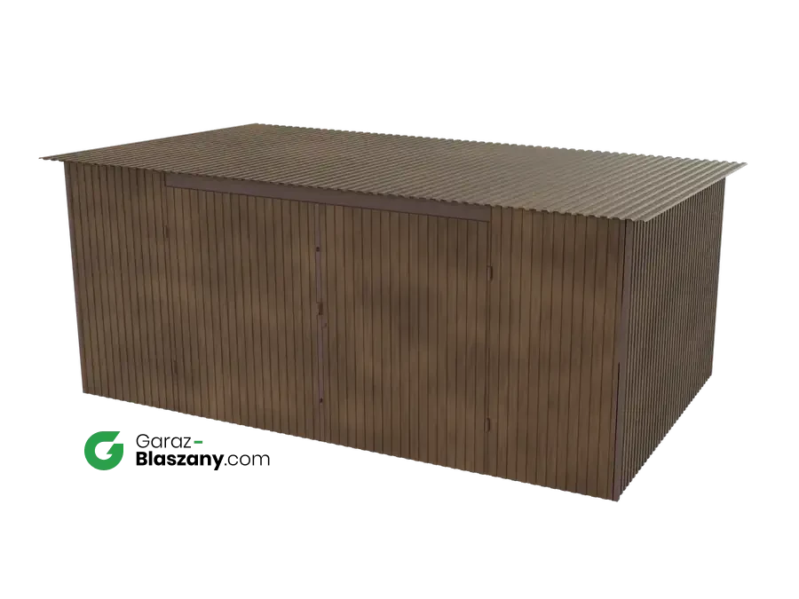 Garaż blaszany 5x3 drewnopodobny Orzech dach jednospadowy brama dwuskrzydłowa