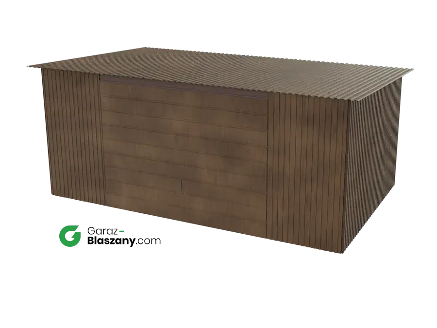 Garaż blaszany 5x3 drewnopodobny Orzech dach jednospadowy brama uchylna
