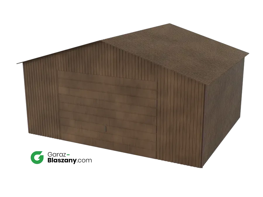 Garaż blaszany 5x4 drewnopodobny Orzech dach dwuspadowy brama uchylna