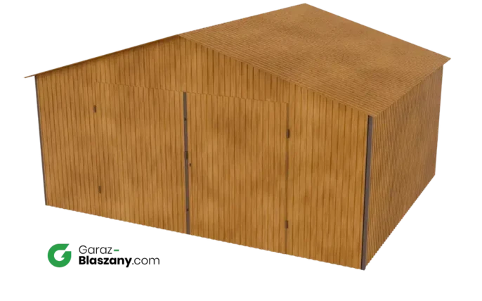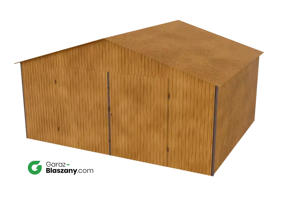 Garaż blaszany 5x4 drewnopodobny Złoty Dąb dach dwuspadowy brama dwuskrzydłowa - doskonale nadaje się jako domek narzędziowy lub niewielki magazyn dla firm. Łączy praktyczne zalety typowego garażu z minimalnym wykorzystaniem przestrzeni co czyni go uniwersalnymi idealnym do montażu na gęściej zabudowanych przestrzeniach.