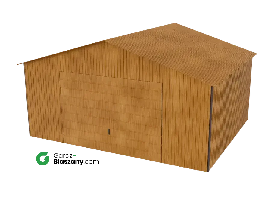 Garaż blaszany 5x4 drewnopodobny Złoty Dąb dach dwuspadowy brama uchylna