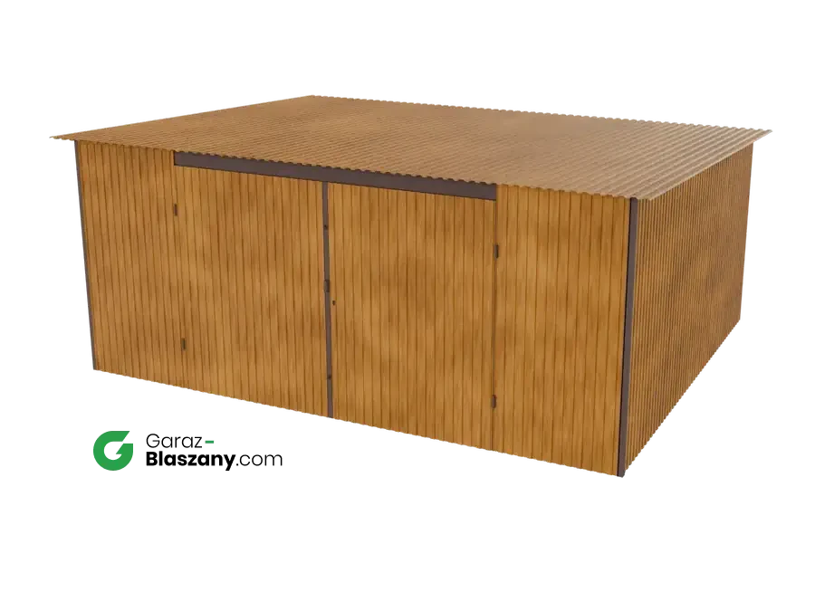 Garaż blaszany 5x4 drewnopodobny Złoty Dąb dach jednospadowy brama dwuskrzydłowa - doskonale nadaje się jako domek narzędziowy lub niewielki magazyn dla firm. Łączy praktyczne zalety typowego garażu z minimalnym wykorzystaniem przestrzeni co czyni go uniwersalnymi idealnym do montażu na gęściej zabudowanych przestrzeniach.
