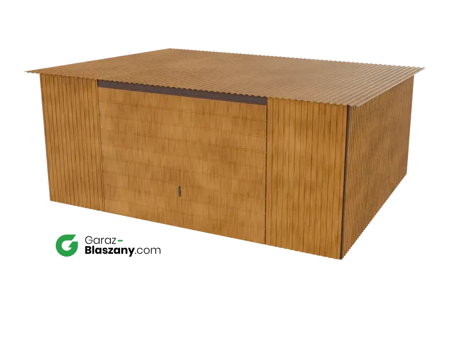 Garaż blaszany 5x4 drewnopodobny Złoty Dąb dach jednospadowy brama uchylna