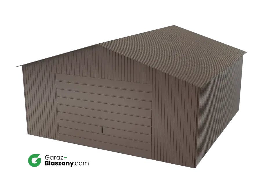 Garaż blaszany 5x5 brązowy BŁYSK dach dwuspadowy brama uchylna