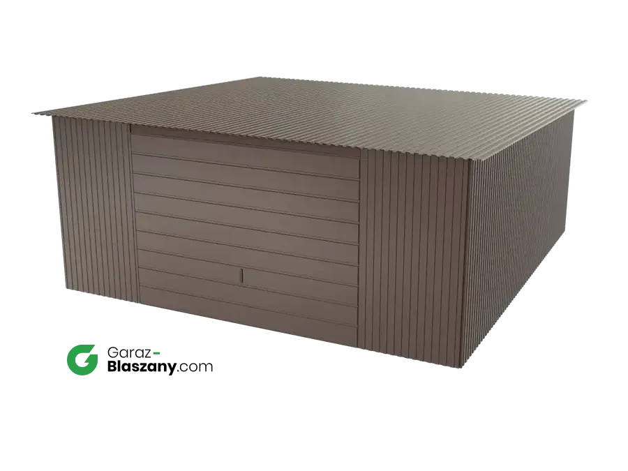 Garaż blaszany 5x5 brązowy BŁYSK dach jednospadowy brama uchylna