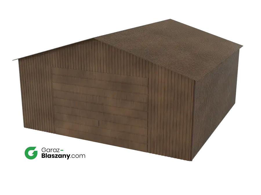 Garaż blaszany 5x5 drewnopodobny Orzech dach dwuspadowy brama uchylna