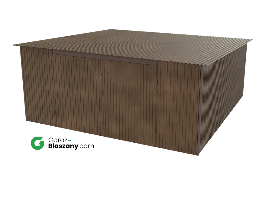 Garaż blaszany 5x5 drewnopodobny Orzech dach jednospadowy brama dwuskrzydłowa - doskonale nadaje się jako domek narzędziowy lub niewielki magazyn dla firm. Łączy praktyczne zalety typowego garażu z minimalnym wykorzystaniem przestrzeni co czyni go uniwersalnymi idealnym do montażu na gęściej zabudowanych przestrzeniach.
