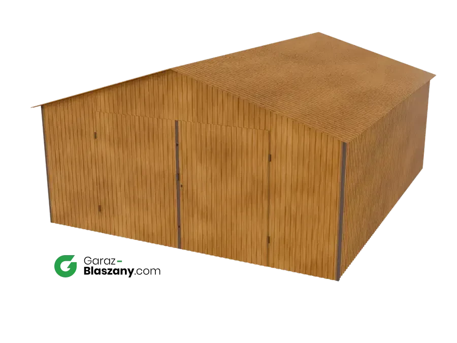 Garaż blaszany 5x6 drewnopodobny Złoty Dąb dach dwuspadowy brama dwuskrzydłowa