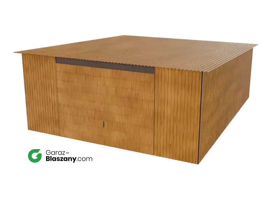 Garaż blaszany 5x6 drewnopodobny Złoty Dąb dach jednospadowy brama uchylna
