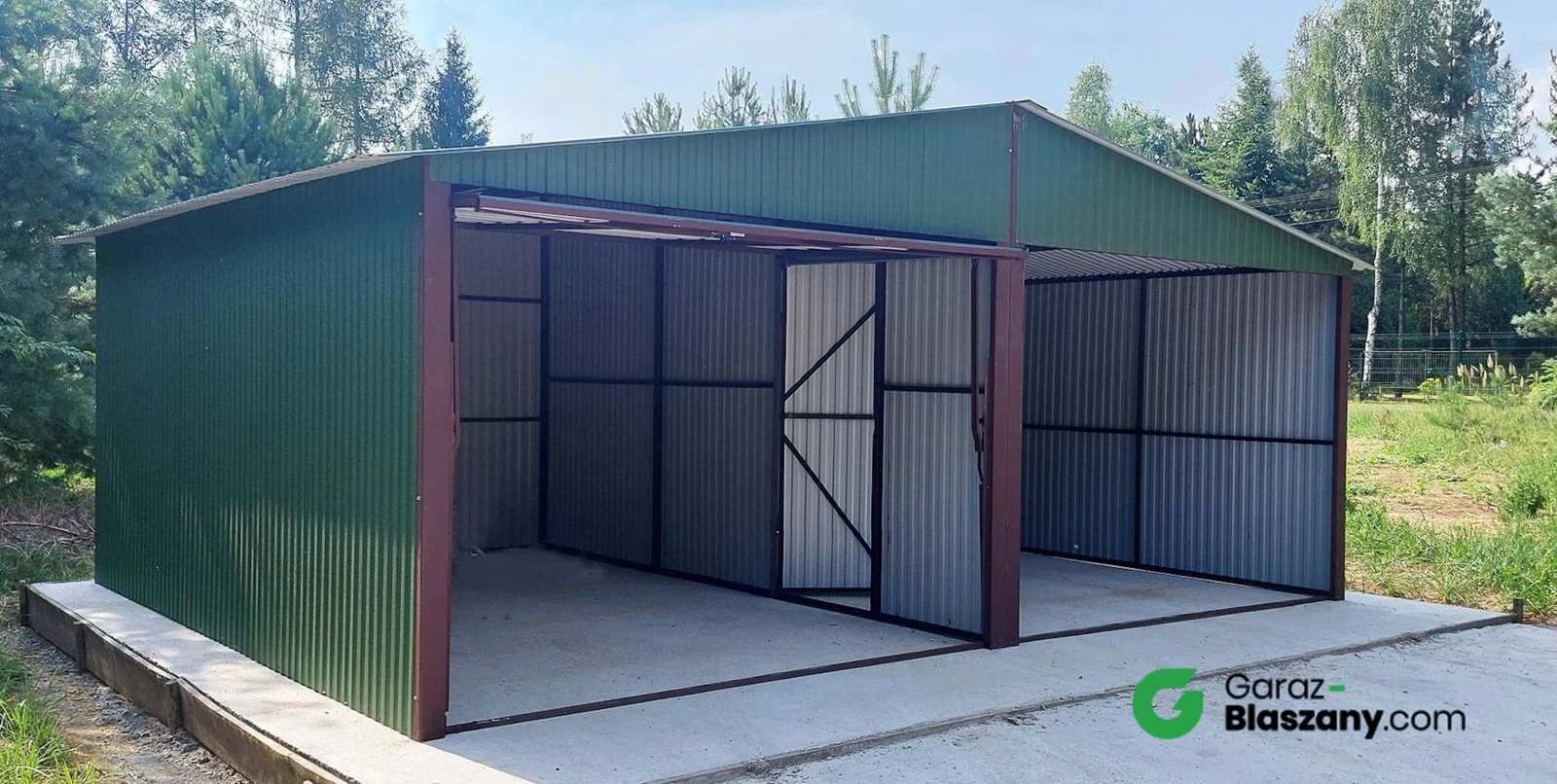 Garaż blaszany 6x5 zielony MAT, dach dwuspadowy, brama uchylna, wiata