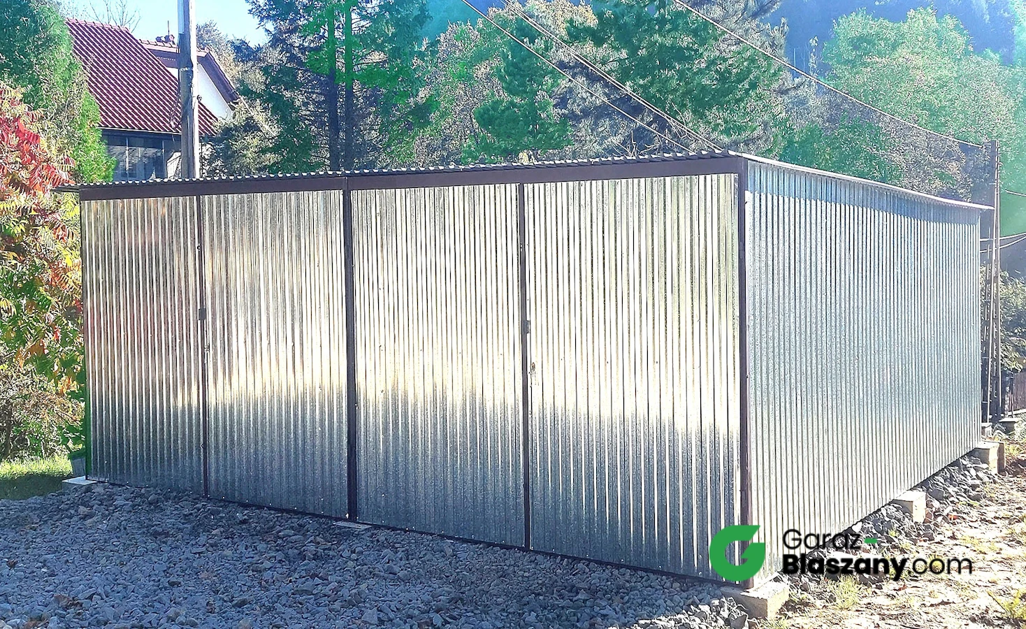 Garaż blaszany 6x5,5 ocynk, dach jednospadowy, brama dwuskrzydłowa