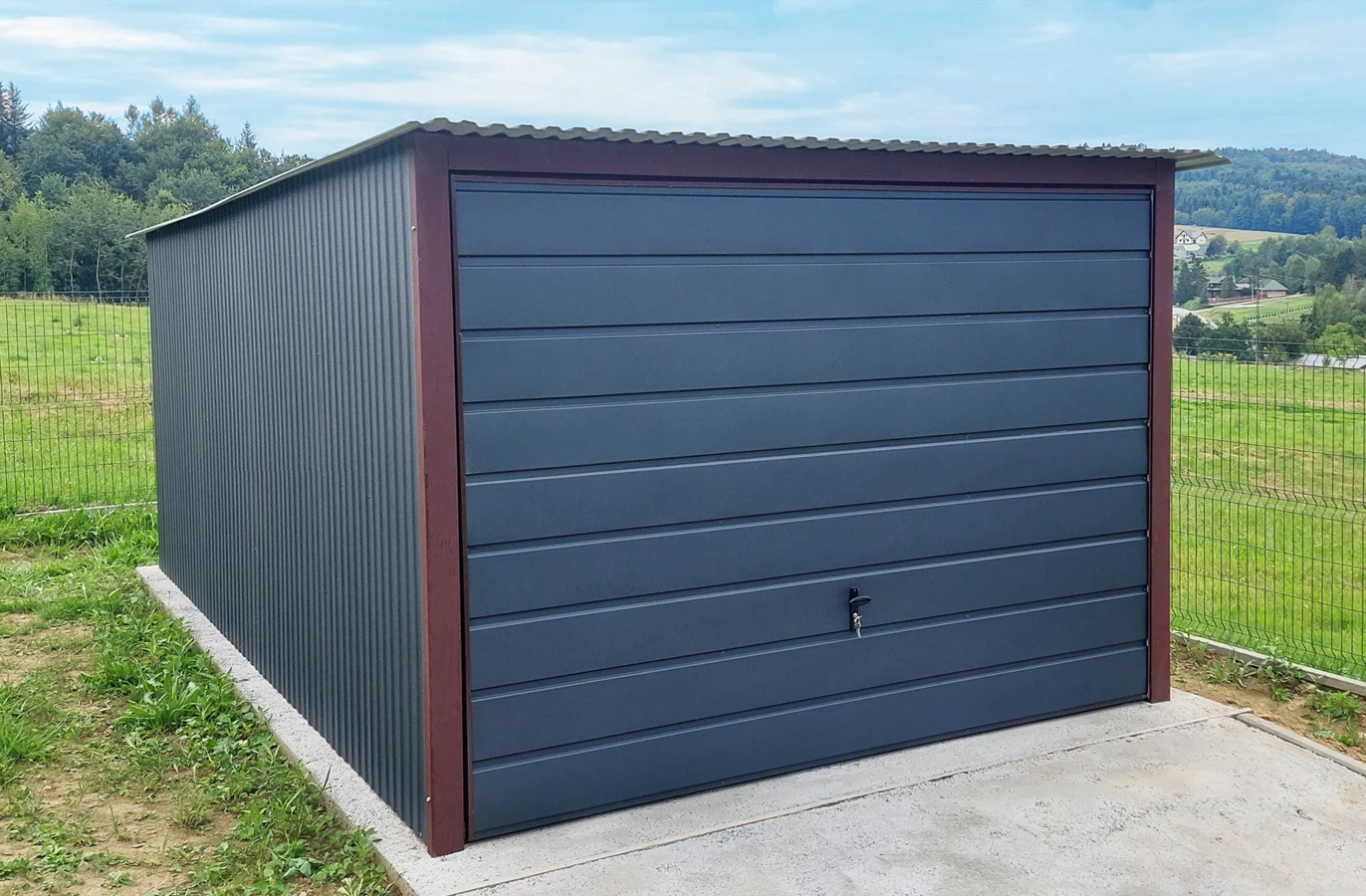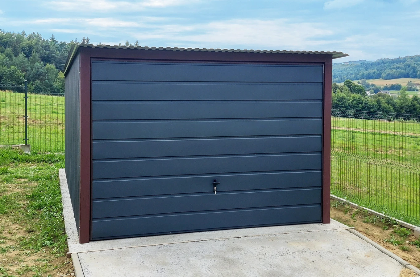 Garaż blaszany akrylowy 3x6 (grafit RAL Mat 7016), jednospadowy, brama uchylna szeroki panel - świetne rozwiązanie jako garaż dla samochodu lub schowek narzędziowy, a nawet jako domek ogrodowy.