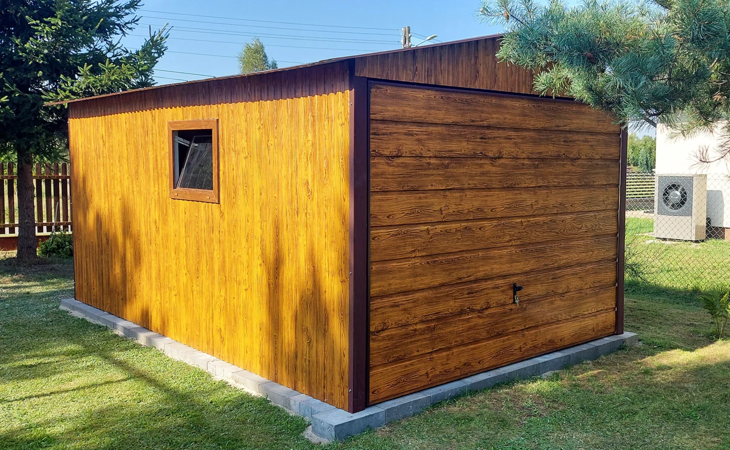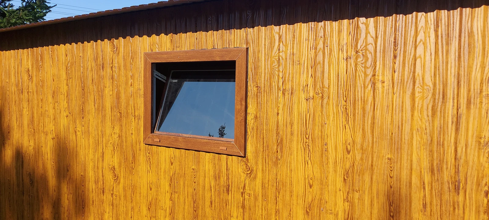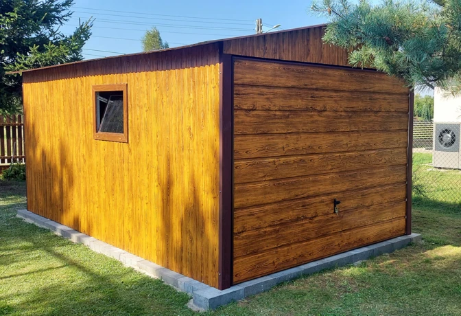 Garaż blaszany drewbnopodobny 3x6, dwuspadowy, brama uchylna szeroki panel, okno