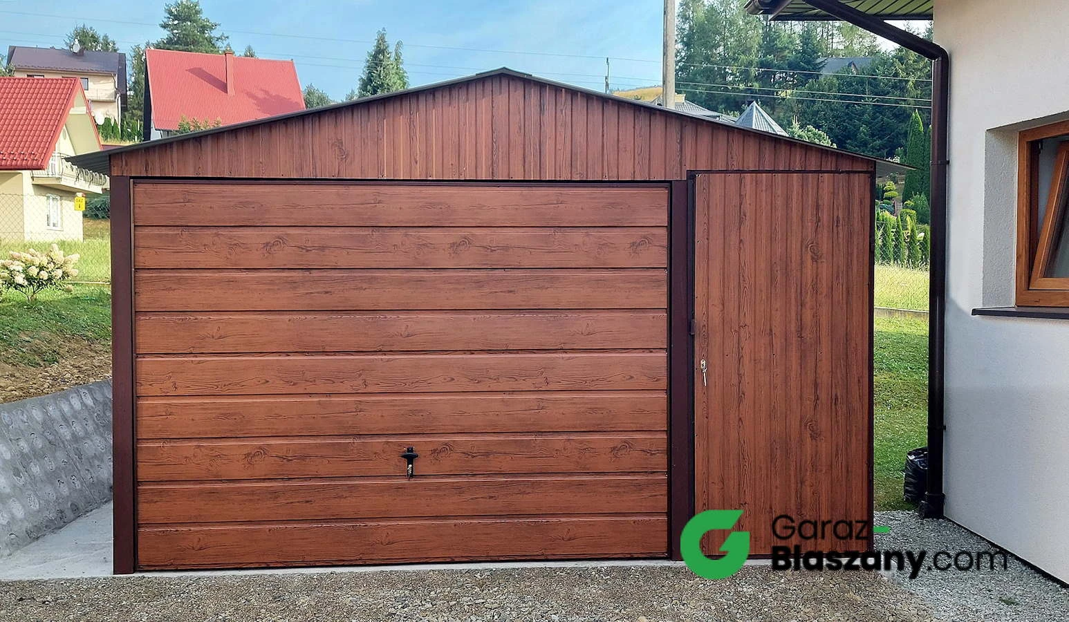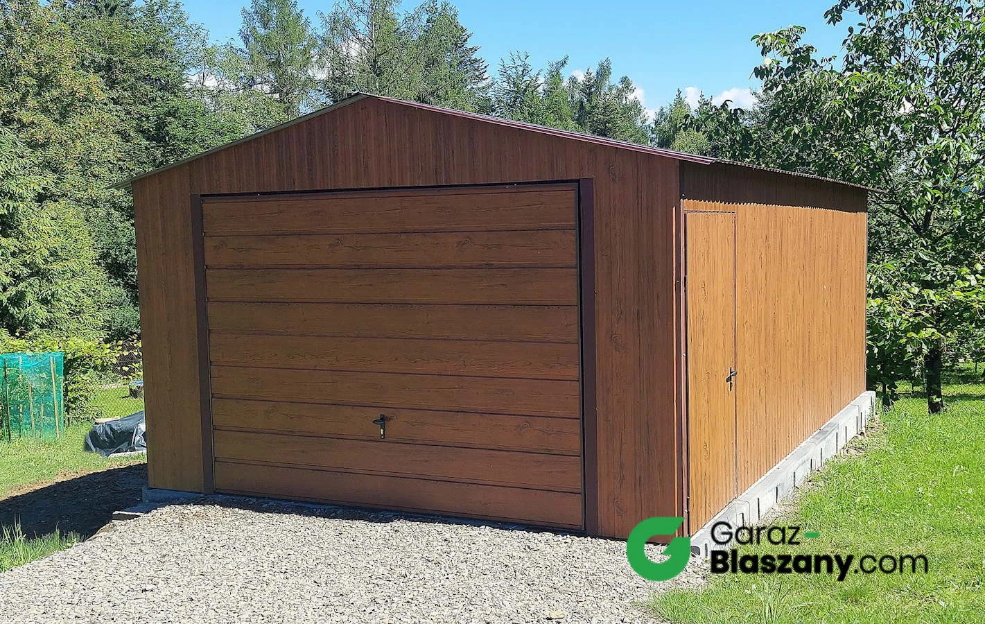 Garaż blaszany drewbnopodobny Orzech 4x5 dwuspadowy, brama uchylna szeroki panel, furtka