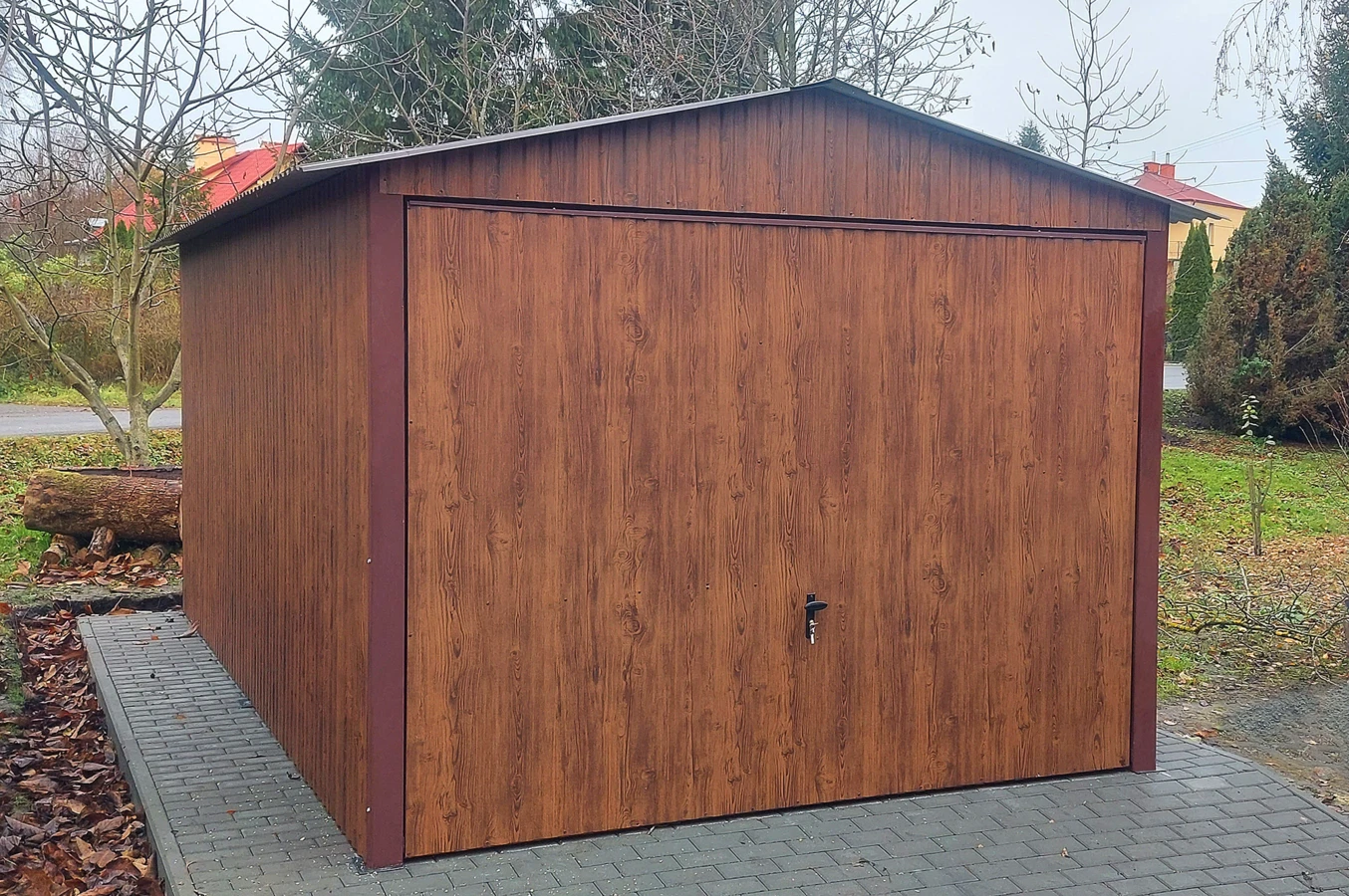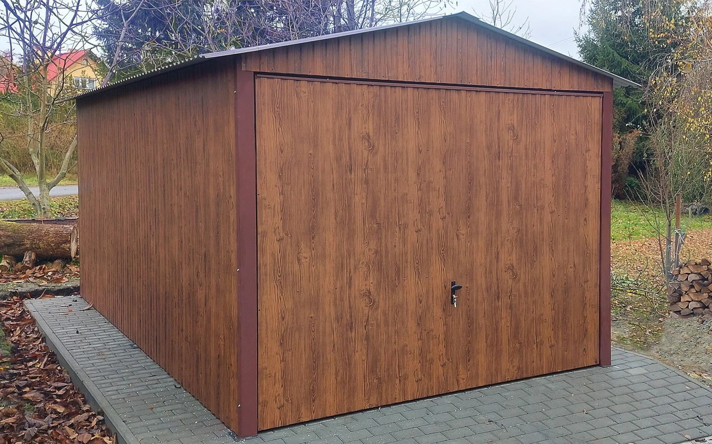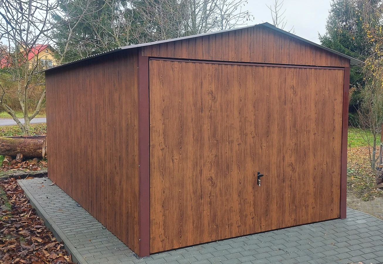 Garaż blaszany drewnopodobny 3x5, dwuspadowy, brama uchylna, kolor orzech - świetne rozwiązanie jako garaż dla samochodu lub schowek narzędziowy, a nawet jako domek ogrodowy.
