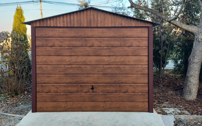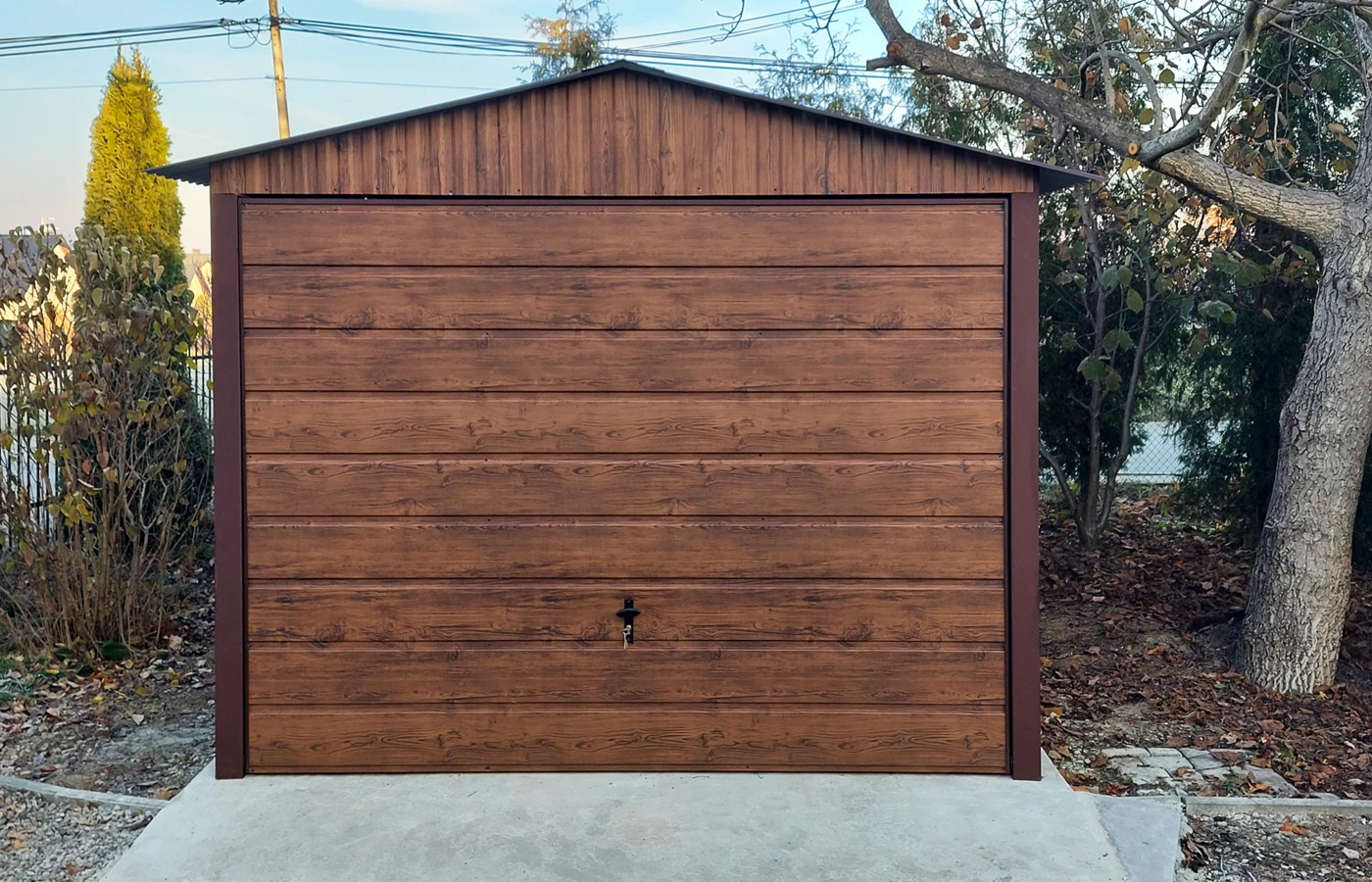 Garaż blaszany drewnopodobny 3x5, dwuspadowy, brama uchylna szeroki panel, kolor orzech - świetne rozwiązanie jako garaż dla samochodu lub schowek narzędziowy, a nawet jako domek ogrodowy.