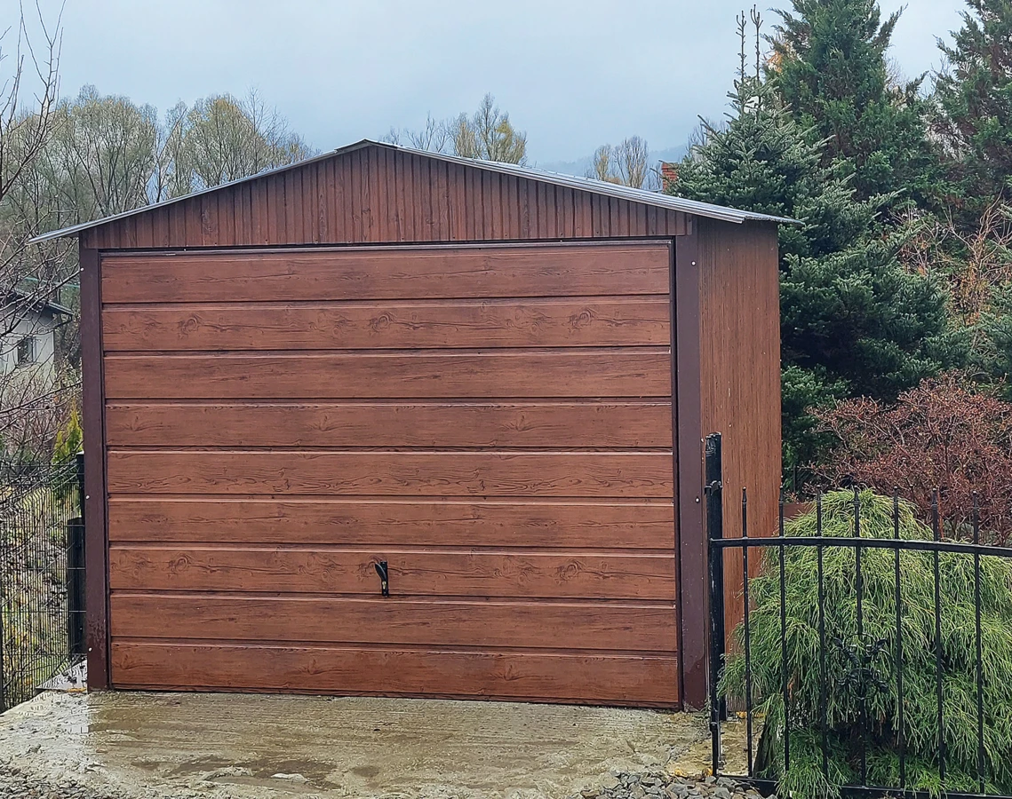 Garaż blaszany drewnopodobny 3x5, dwuspadowy, brama uchylna szeroki panel, kolor orzech