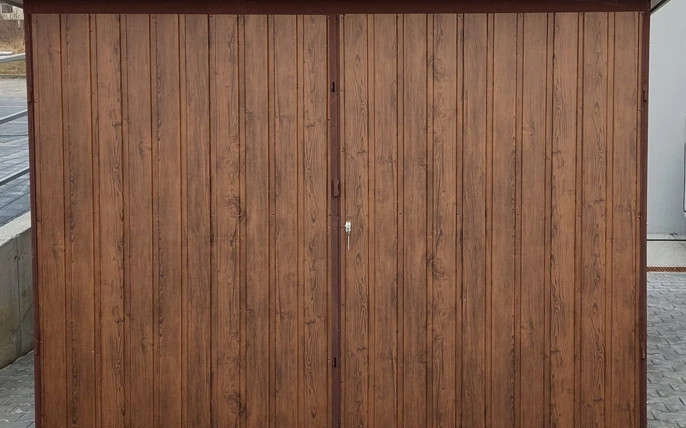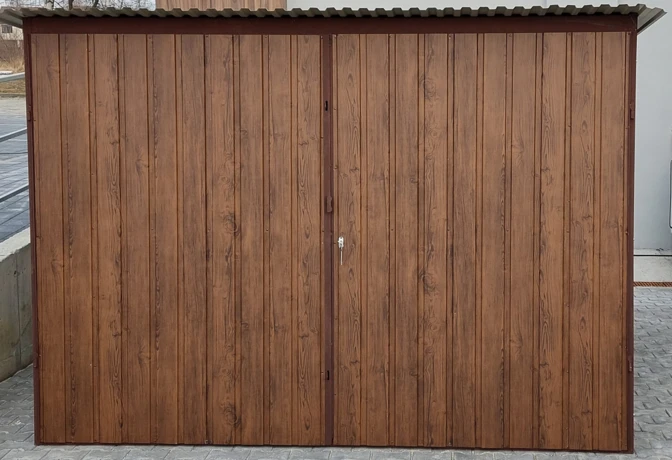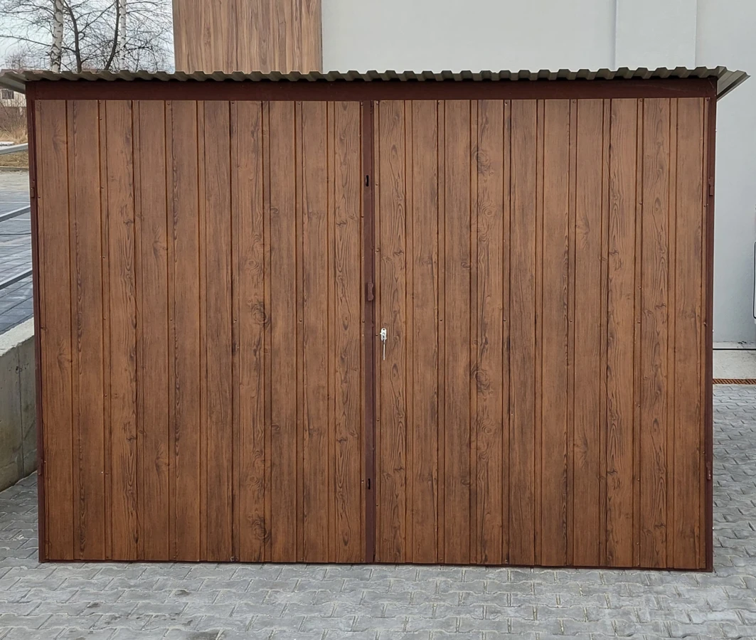 Garaż blaszany drewnopodobny 3x5, jednospadowy, brama dwuskrzydłowa, kolor orzech - świetne rozwiązanie jako garaż dla samochodu lub schowek narzędziowy, a nawet jako domek ogrodowy.