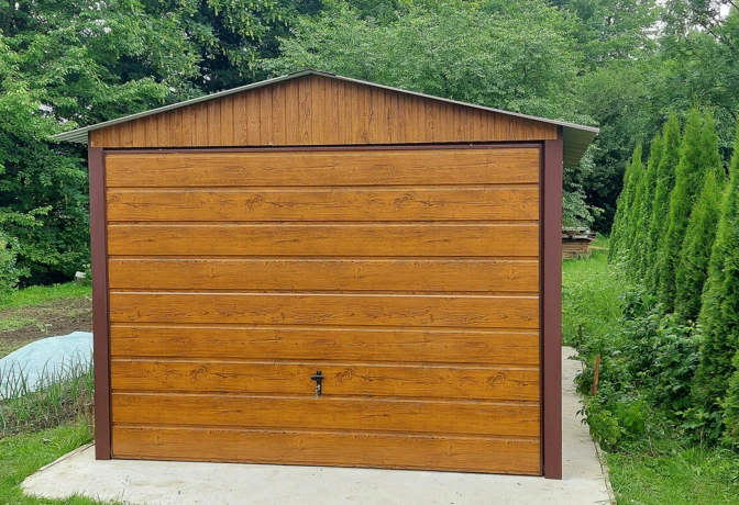 Garaż blaszany drewnopodobny 3x5, jednospadowy, brama dwuskrzydłowa, kolor złoty dąb